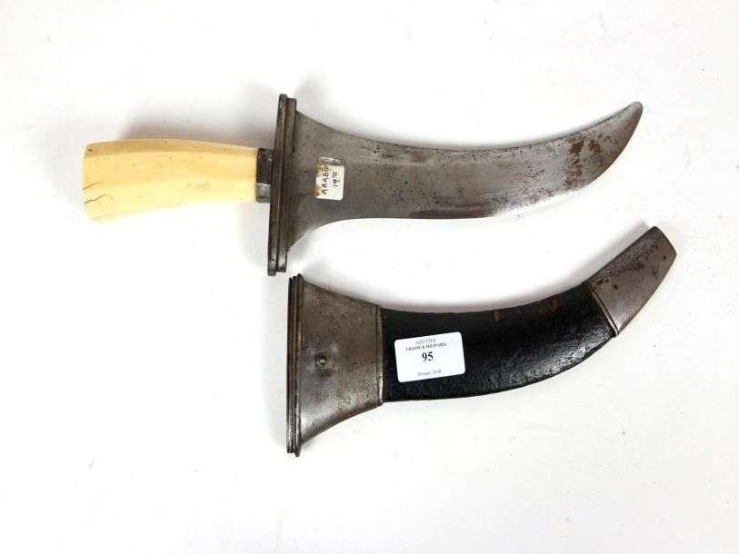 Poignard arabe. Poignée en ivoire. Forte lame à deux tranchants. Fourreau en cuir, à deux garnitures en fer. (fêles, usures)