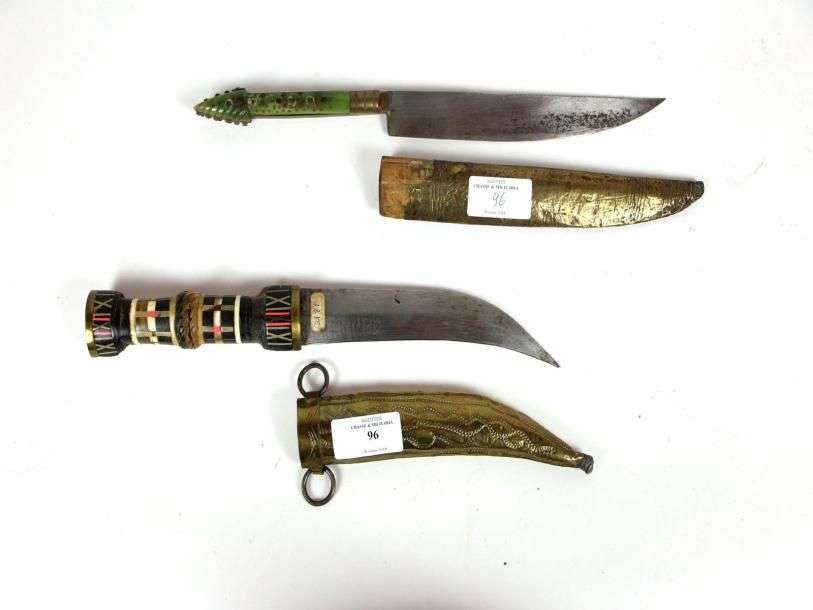 Lot de 2 poignards orientaux. Fourreaux recouverts de cuivre décoré.