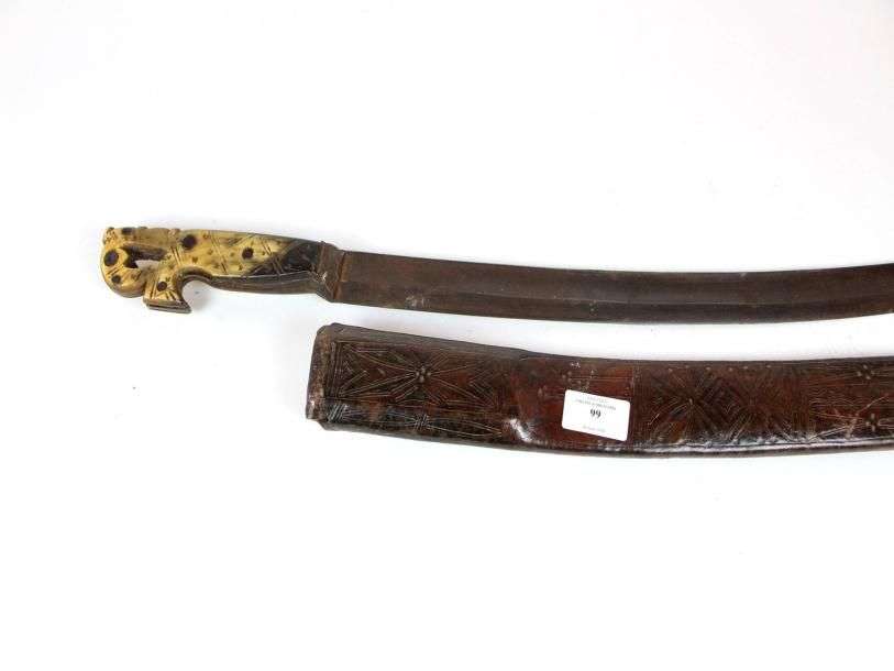 Sabre oriental. Poignée à plaquettes de corne, décorée. Lame courbe, à pans creux. Fourreau en cuir, à décor gaufré. Dans l'état