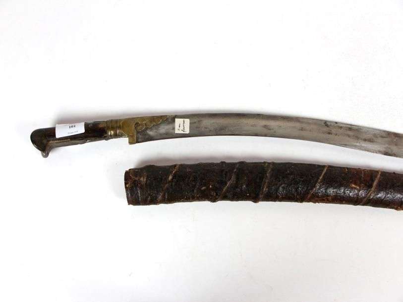 Sabre ottoman, dit yatagan. Poignée à plaquettes de corne. Lame courbe. Fourreau recouvert de cuir. Dans l'état