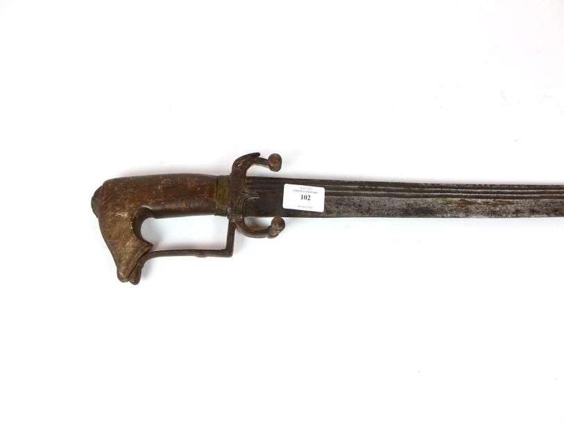 Sabre marocain, dit nimcha. Poignée en corne. Monture en fer. Garde à une branche et trois antennes. Lame courbe, à trois gouttières. ME SF