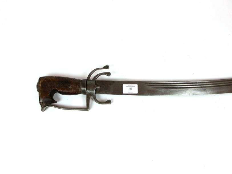 Sabre marocain, dit nimcha. Poignée en corne. Monture en fer. Garde à une branche et trois antennes. Lame courbe, à trois gouttières. EM SF