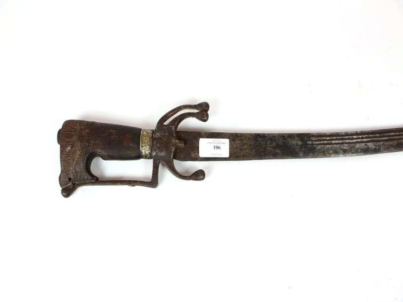 Sabre marocain, dit nimcha. Poignée en corne. Monture en fer. Garde à une branche et trois antennes. Lame courbe, à trois gouttières. ME SF