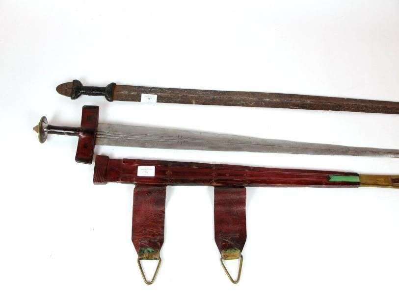 Lot de 2 sabres africains. Lames à deux tranchants. 1 fourreau en cuir.