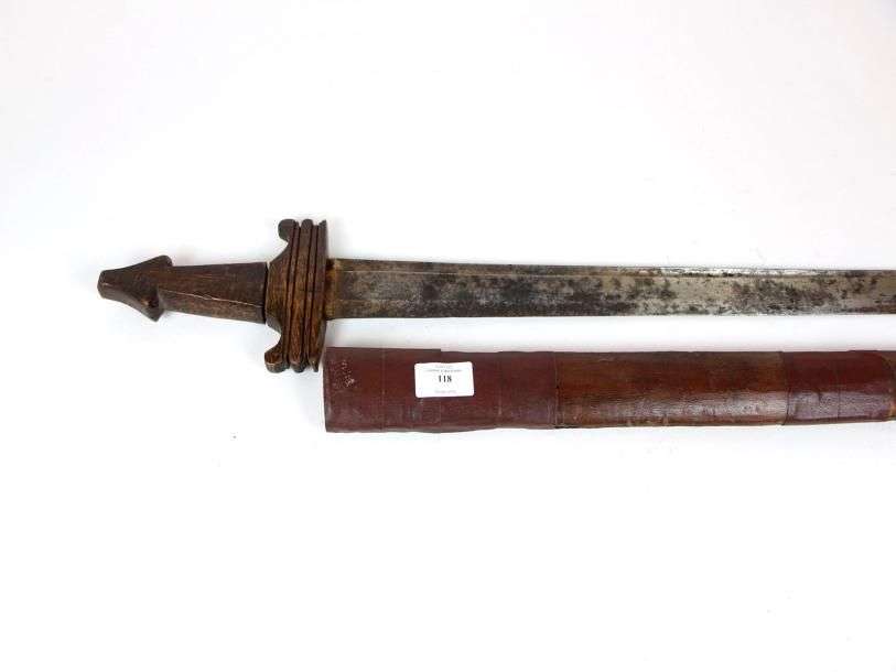 Sabre touareg. Poignée en bois. Lame à dos plat, pans creux et gouttière, gravée. Fourreau recouvert de cuir, renforcé de toile autocollante. Dans l'état