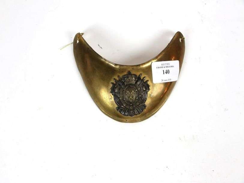 Hausse-col d'Officier. Plateau en laiton, avec reste de dorure, motif argenté aux Armes de France. Époque Restauration (remontage, peau postérieure)