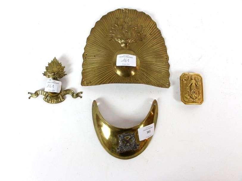 Lot de 4 cuivreries : plaque de bonnet à poils | plateau de ceinturon d'Officier | hausse-col d'Officier | grenade de shako de l'École spéciale militaire.