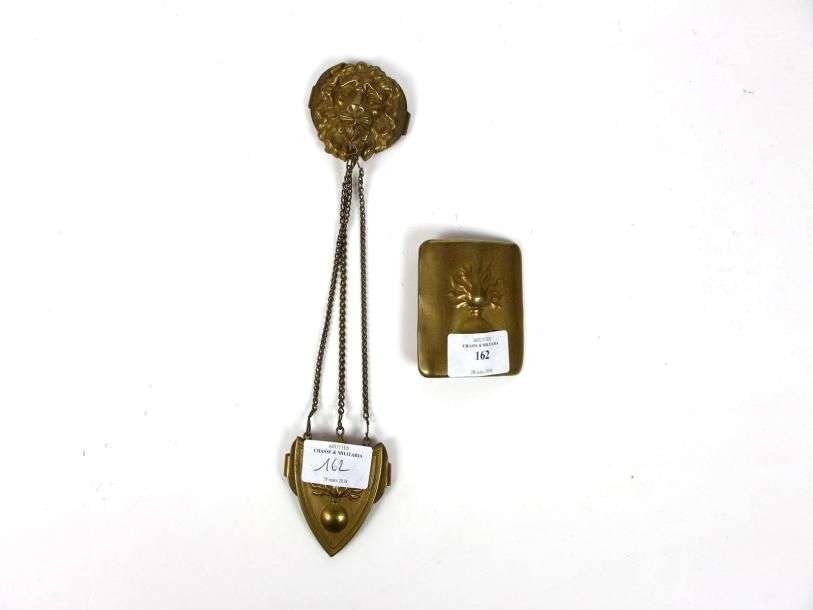 Lot de 2 cuivreries : plateau de ceinturon à la grenade | attributs de ban