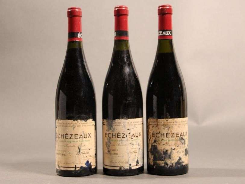 3B ECHEZEAUX (Grand Cru) 1 à 2,5 cm| e.q.i. avec 1 millésime illisble| contre-étiquettes très abimées dont 2 quasi inexistantes Domaine de la Romanée Conti 1991