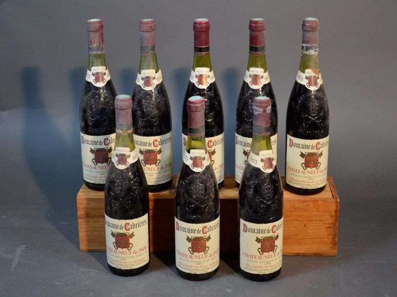 8 B CHATEAUNEUF DU PAPE Rouge (1 à 2,8| 2 à 3| 2 à 3,5| 1 à 3,8 et 1 à 5 cm| quelques marques et accrocs étiquettes| c.s. à c.c.) Domaine de Cabrières 1975