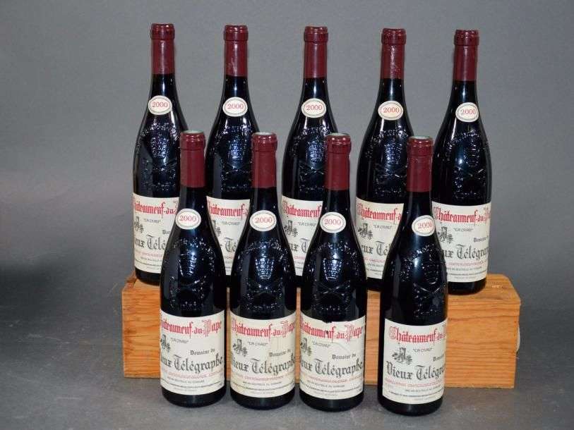 9 B CHATEAUNEUF DU PAPE Rouge (étiquettes avec plissures d'origine dont 2 e.t.h. légères et 1 e.l.a.) Domaine du Vieux Télégraphe 2000