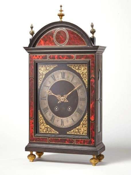 en bois noirci et incrustations de laiton. Le cadran en bronze argenté encadré d'éléments décoratifs en applique de bronze doré sur fond de velour.