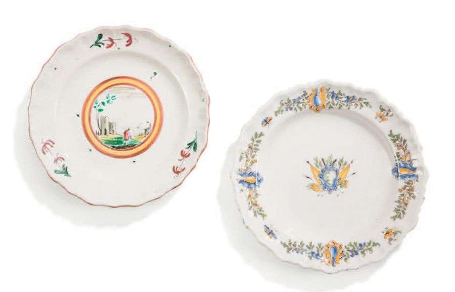 Ensemble de deux assiettes, l'une à bordure contournée à décor polychrome, dit au drapeau, encadré de rinceaux et de fleurs.