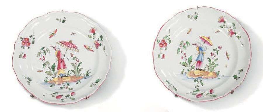 Paire d'assiettes en faience à décor polychrome de deux personnages chinoisant.