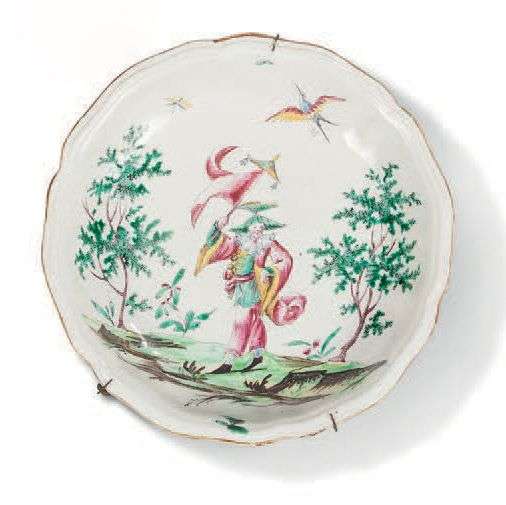 Assiette creuse à bords chantournés à décor polychrome d'un personnage chinoisant.