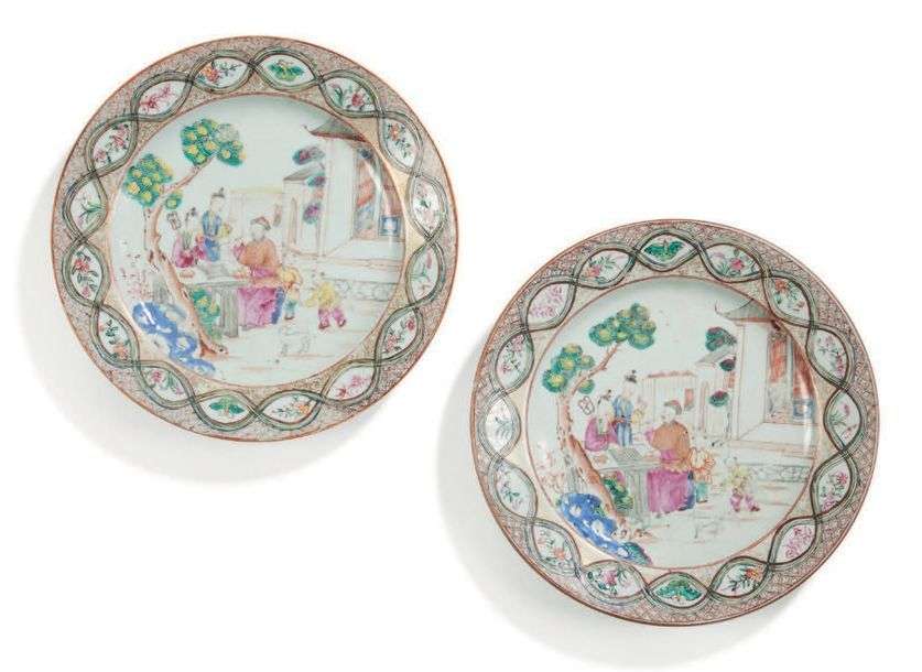 Paire d'assiettes rondes décorées en émaux de la famille rose de personnages assis dans un jardin au jeu de Go avec deux enfants et un chien| guirlande sur l'aile décorée de fleurs alternée de papillons.