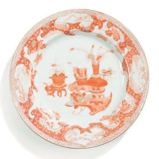 Deux assiettes rondes, l'une décorée en rouge de fer et or de «mobilier» chinois encadré de rinceaux fleuri et de paysages en réserve.