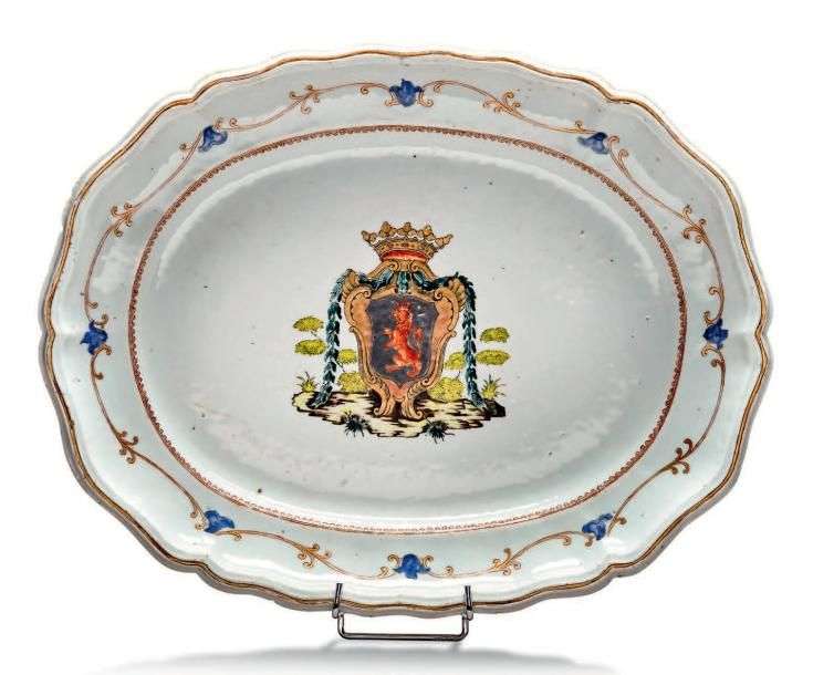 GRAND PLAT OVALE à bord chantourné en porcelaine à décor armorié sur fond