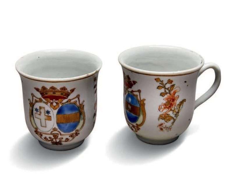 PAIRE DE TASSES en porcelaine à décor polychrome des armoiries de Louis Billouart de Kerlcrec dernier gouverneur de la Louisiane de 1753 à 1763 et de son épouse Marie-Joseph-Charlotte Du Bot.
