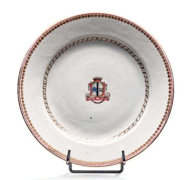 ASSIETTE RONDE en porcelaine à décor polychrome aux armoiries des Sauget de Franche-Comté associé aux armes des Porcellets marquis de Maillane de Provence.