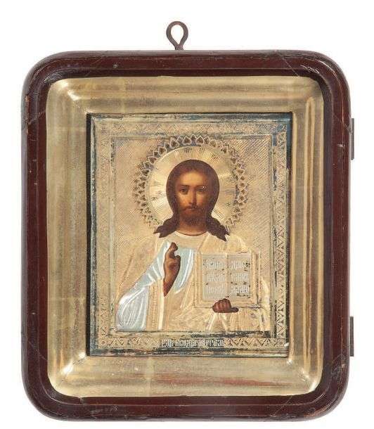 ICÔNE figurant le Christ Pantocrator sous riza de cuivre travaillé au repoussé.