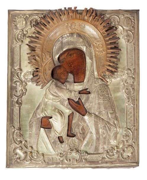 ICÔNE figurant la vierge à l'enfant sous riza de cuivre travaillé au repoussé.