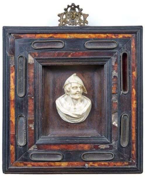 Figurine en ivoire dans un cadre en bois noirci et écaille.