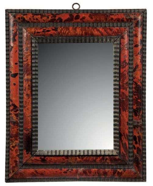 MIROIR À DOUBLE ENCADREMENTS d'écaille et filet de bois noirci ondé.
