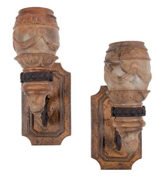 MODIFICATION CATALOGUE// PAIRE DE PORTE TORCHÈRES en albâtre à décor de draperies, frises et pommes de pin. Elles sont retenues par une monture en fer forgé.