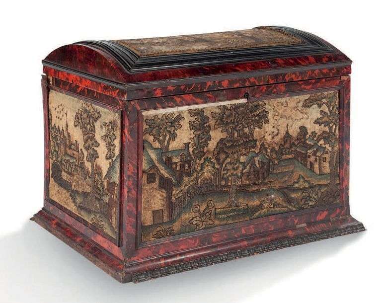 COFFRET BOMBÉ en écaille agrémenté sur les quatre faces et le couvercle de tapisserie aux points à décor de villages champètres. Intérieur garni de soie rouge.
