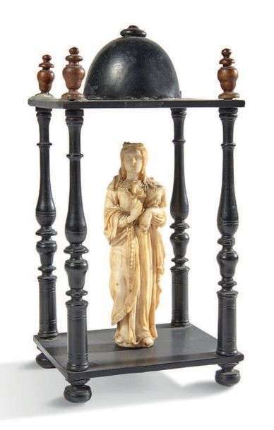 VIERGE À L'ENFANT en ivoire sculpté dans un petit temple en bois tourné noirci.