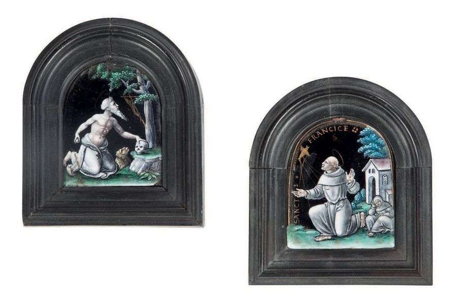 Ensemble de deux plaques en cuivre émaillé figurant pour l'une Saint François et pour l'autre un adorant.