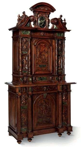 Cabinet de style néo Renaissance en noyer richement sculpté et ciselé de scènes mythologiques, personnages, mascarons, têtes de boucs.