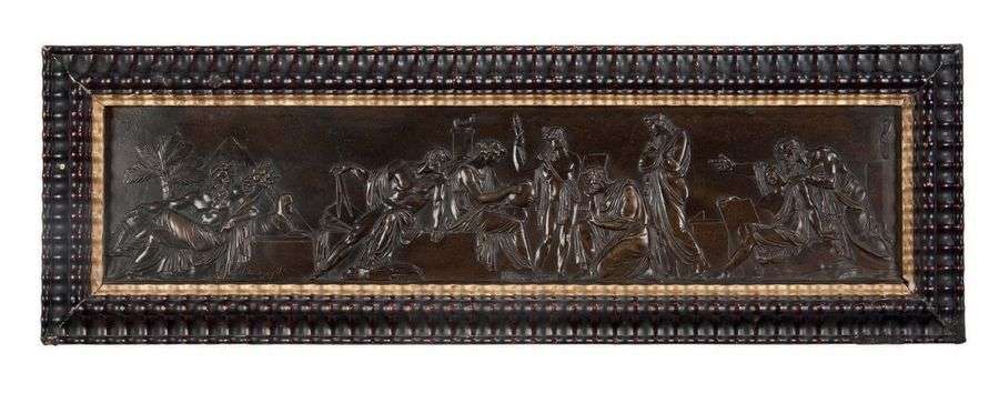 Bas relief en bronze à patine brune figurant une représentation allégorique des arts.