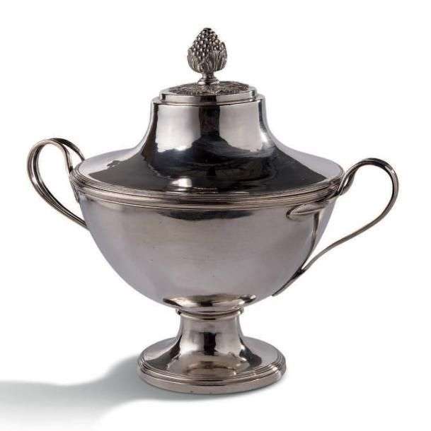 SOUPIÈRE RONDE sur piédouche en argent, modèle uni à décor au filet. Frétel formé d'une grappe de raisins, les anses en tiges feuillagées.