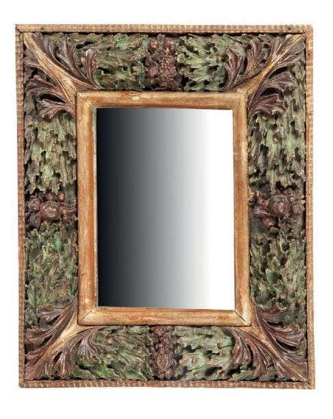PETIT MIROIR en bois sculpté à décor en haut relief de feuillages de chêne en polychromie.