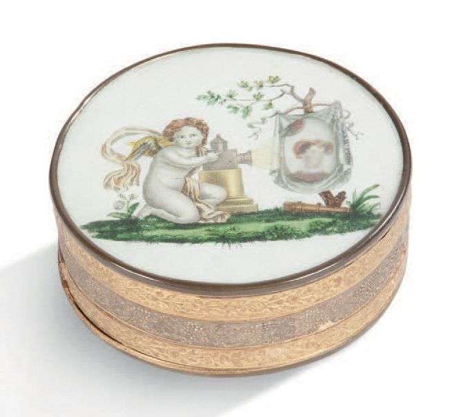 BOÎTE CIRCULAIRE en carton doré à décor d'un fixé sous verre représentant