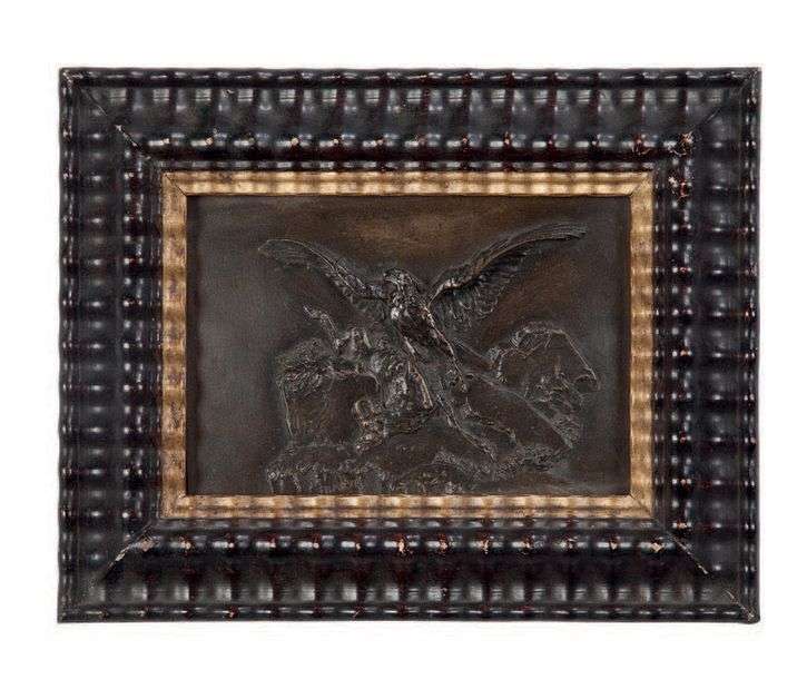 Suite de quatre bas reliefs en bronze, dans des cadres en bois ondé