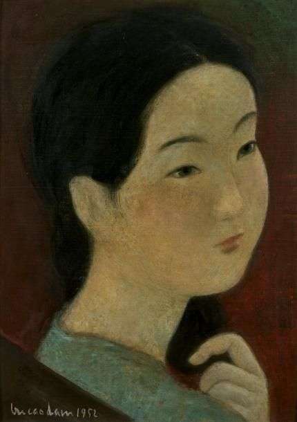 Sur un fond sombre, se détache le portrait d'une jeune fille au teint clair, signe d'une grande beauté, dont la pureté de la carnation est renforcée par des cheveux d'ébène et des lèvres rouges. Par la délicatesse d'un trait fin, Vu Cao Dam rend ici hommage à la splendeur féminine asiatique.