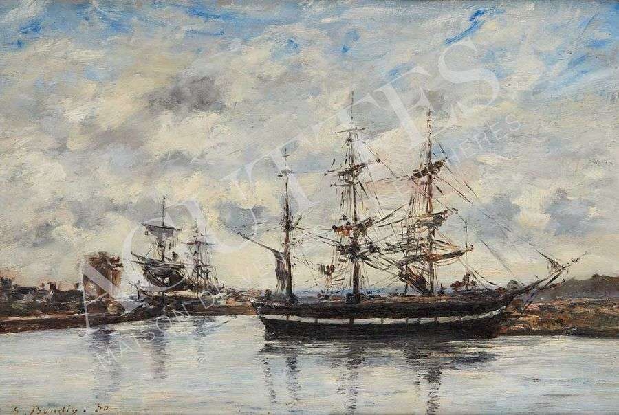 Cette toile proposée à la vente, datée de 1880, s'insère dans la continuité de la recherche impressionniste de l'artiste. La touche est de plus en plus libérée. Sous l'influence de Corot, Boudin met l'accent sur le ciel et les effets atmosphériques dans une facture rapide. La rapidité du geste de l'artiste permet de capter et de restituer la mouvance de la lumière et de l'eau. Influencé par son maître, le peintre de marine Isabey, Boudin porte un vif intérêt pour ce genre de peinture.
