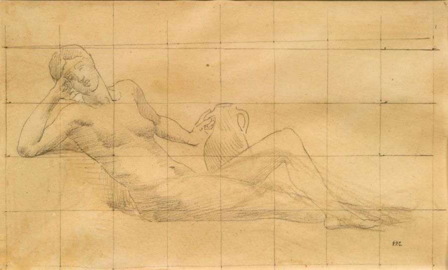 Porte en bas à droite le cachet P.P.C Etude de la figure centrale du tableau Vision antique commandé à Puvis de Chavannes pour décorer l'escalier du Musée des Beaux-Arts de Lyon.