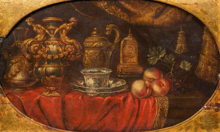 Nature morte aux pièces d'orfèvrerie, de porcelaine, pendule de table et pêches.