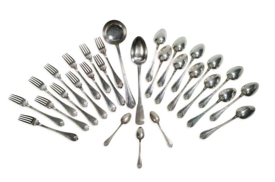 PARTIE DE MÉNAGÈRE EN ARGENT COMPRENANT: une louche, douze cuillères, douze fourchettes et trois cuillères à dessert