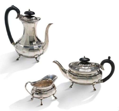 SERVICE À THÉ ET À CAFÉ en argent (925 millièmes), composé d'une théière, d'une cafetière et d'un pot à lait, à cotes plates reposant sur quatre pieds. Les anses à enroulements de la cafetière et de la théière ainsi que les prises en bois noirci.