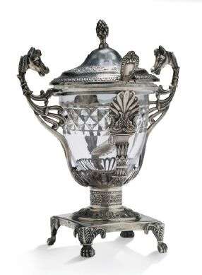 CONFITURIER en argent à décor de guirlandes de fleurs, palmettes, têtes de chevaux et cygnes affrontés.