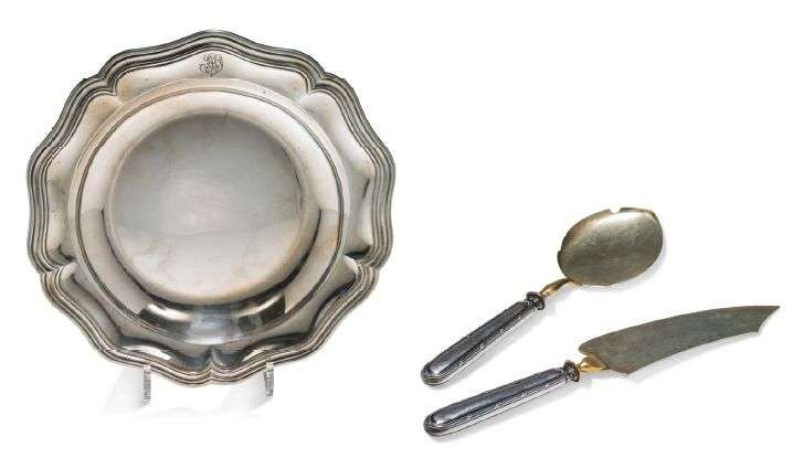 PUIFORCAT Pelle à tarte et cuillière de service en métal, modèle à filets rubannés, manche en argent fourré.
