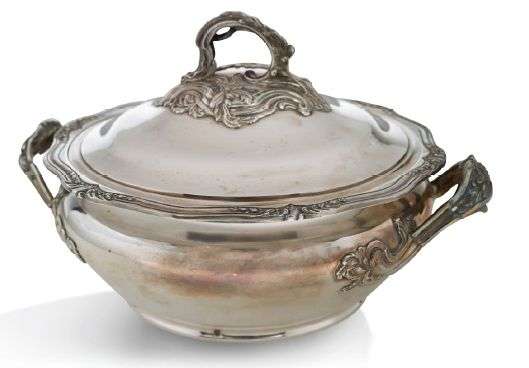 Légumier couvert en argent chiffré, les anses à riche décor de volutes feuillagées.