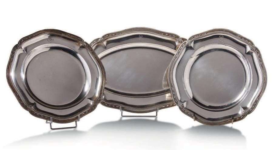 Suite de quatre plats de service en argent à décor de frises et palmettes, comprenant deux plats ronds, un plat creux quadrangulaire, un plat ovale et une saucière. Chiffrés.