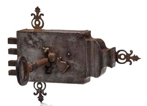 BELLE SERRURE en fer forgé, la platine rectangulaire et à décor d'un culot