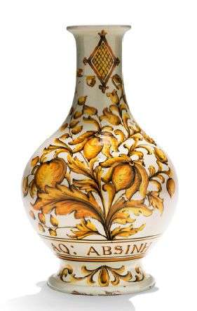 Bouteille en faïence à décor en camaïeu de jaune, ocre et manganèse d'un large bouquet, losange fleuronné au col et rinceaux sous l'inscription: AQ: ABSINH.